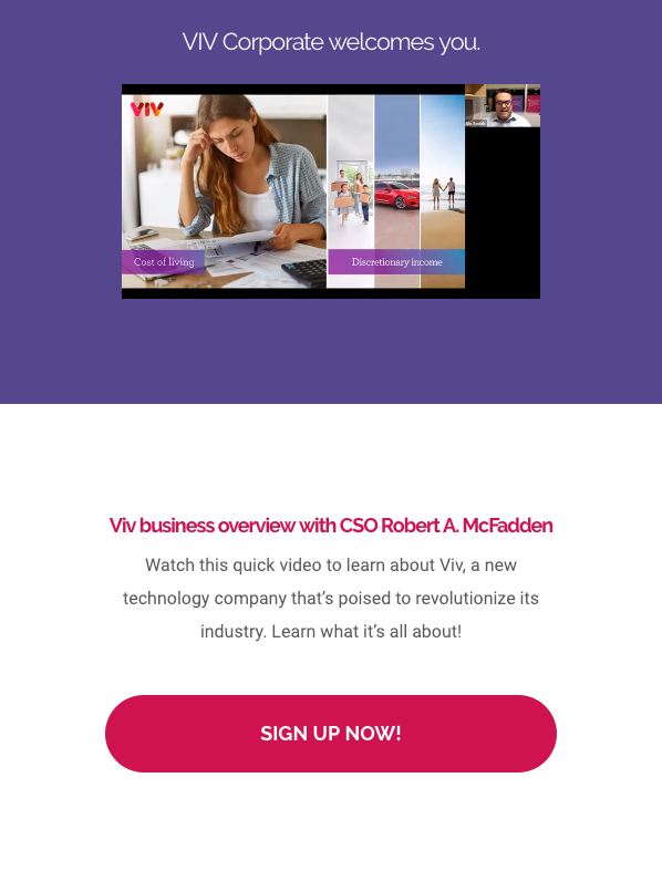Share the Viv Business Overview with anyone from anywhere simply with this Viv Social Webinar. In this presentation, CSO Robert A. McFadden walks through all the reasons why joining Viv right now is the best time, and explains how we provide a platform of products that can make life simply better. Your prospect can either register to watch the webinar at the given times, or they can watch the replay at any time they choose.
